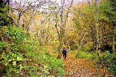 先ほどの登って来たゲレンデを下り木戸峠分岐で直進して汁谷へ。汁谷は期待通りの黄葉が拡がっていた。牛コバ・オトワ池分岐までの遊歩道を楽しむ。牛コバ・オトワ池分岐にあるあづま屋にリュックを置いて夫婦滝を往復する。来週ぐらい最高の黄葉が見られそうな白滝谷を下り牛コバへ。途中、小雨が降り傘をさして歩く。白滝谷コースは平成8年11月17日参考に。
