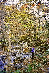 薄っすらと黄葉してきた林道終点までバイクで入る。白滝谷登山口は林道終点にあるが、大橋小屋への登山口は林道終点より60m程戻った所にある。奥の深谷出合までの登山道は記憶が薄れてしまっているがしっかりした道で迷うような道ではなかった。資料をみると前回の下りと同じ所要時間で登っている(前回は20℃・今回は8℃)。