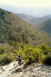 はじめての鉄塔を過ぎ、ピークを越すと道は南方向になり展望の良いアルペン風になる。振り返る(西)と歩いた稜線が見え、遠方には甲山・六甲山が望まれるが眼下には造成地が迫っているのが残念。東には真下にゴルフ場、遠方には五月山・箕面の山々が望まれる。南には瀬戸内海だが霞んで全く見えず。