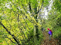 食事後、傘を差して遊歩道を歩きブナ林の黄葉を観察する。