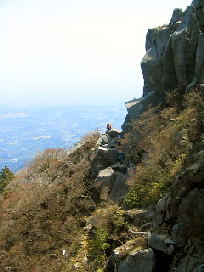 御在所岳へ。9時過ぎだったので直下のクサリ・ロープ付きの急斜面も渋滞なくスムーズに下山。 御在所岳へ |