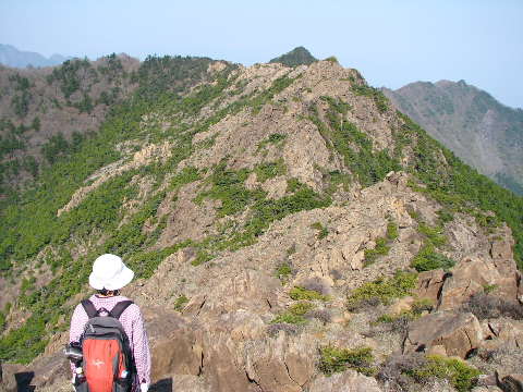 望んだ岩稜歩きだが、緊張の連続で少々疲れてくる。やっと樹林内に入ると、山荘・西赤石山の分岐があり、右折して下って行くと、岩稜から見えていた三角錐の美しい山容の山が前方に立ちはだかり、左の奥には西赤石山の全容が初めて見えた。