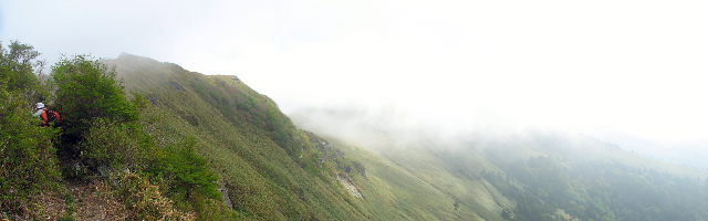 ![]() ⇔標高1630m付近で休憩。ガスがなければ展望のいい所だった。 |