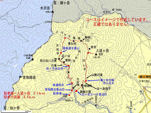 6:47駐車場〓49大谷橋〓7:05林道終点〓22松ノ木谷出合〓7:58尾根道へ〓8:31イワクラ尾根出合〓9:38椿大神社奥宮〓44池ノ谷分岐〓9:48〜10:40入道ヶ岳〓11:22『池ヶ谷コース6』地点・滝ヶ谷分岐〓11:52避難小屋〓12:25池ヶ谷コース登山口〓12:32駐車場 |
