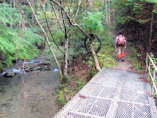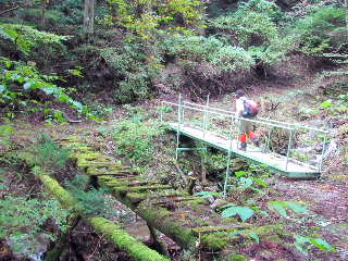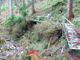 民家から延びる山腹の作業道にたどり着く。やがて谷沿いの道になり、数箇所にある鉄橋を利用して溯上する。2ツの鉄橋が連なる箇所を過ぎ、約7分歩くと二股になる鉄橋に着く。ここで右の谷へ入る。