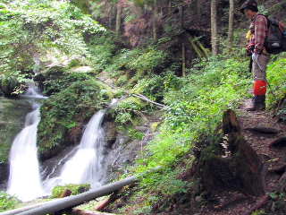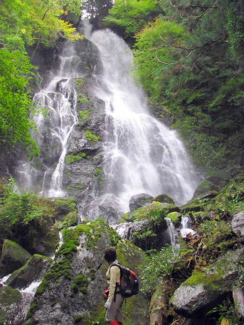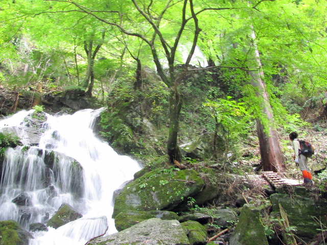 和佐羅滝直下(40m手前)に来ると国見山への道標と踏み跡がある。落差15mの2段滝を観てから、落差30mの和佐羅滝を観る。雨上がりで迫力があり、霧状になった飛沫がかかる。
