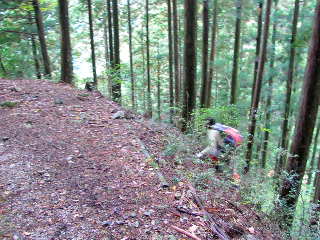 踏み跡があったので、滝左岸をよじ登ることにする。しかし今回も踏み跡が怪しくなり、動物の足跡が・・。獣道か?獣も人間も選ぶルートは同じようである。滝直下の迂回道まで戻れば良かったと思うが、下るのも恐ろしい。仕方なく岩・枝木・根などを利用して、ズルズル滑る急斜面を登る(前回は滝近くの岩場をよじ登った記憶があるのだが)。