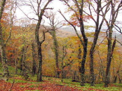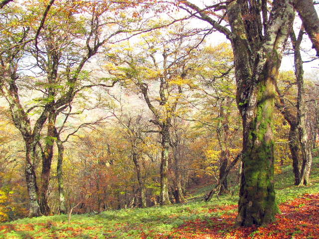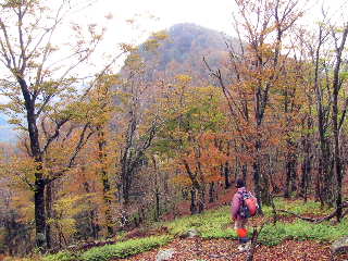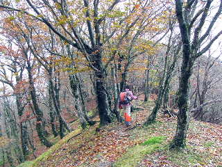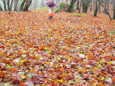 国見山へ。ブナ林の黄葉が綺麗だ。西斜面は強風のために葉を落としてしまっているが、落ち葉の絨毯を踏みながら登るので、冷え切っていた身体は温もり気持ちがよい。