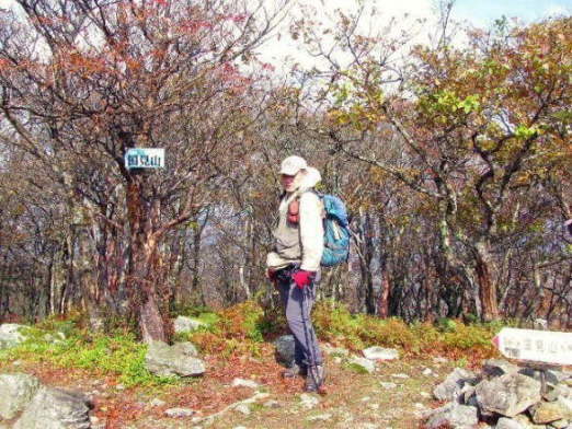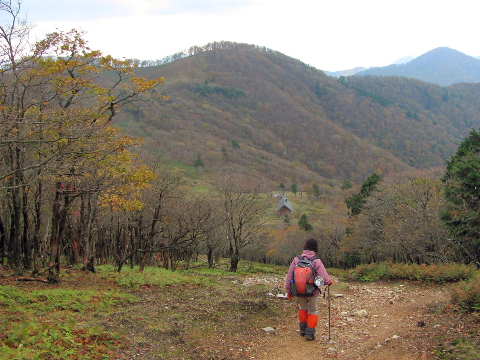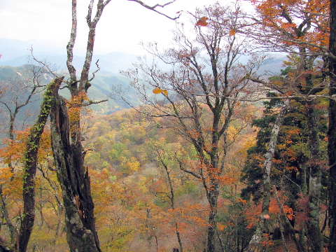 間近の黄葉が見えるだけで全体は判らない。「登っても仕方が無い」と初めて赤ゾレ山には登らずに巻いて通過。完全に諦めモードになって、馬駆ヶ場辻を過ぎる。