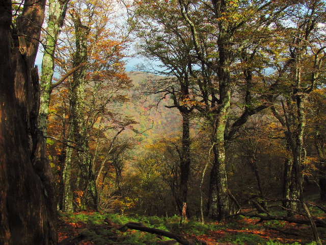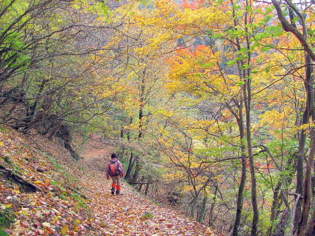 今が紅葉のピークかと云われれば、判断できない。モミジ系は未だ黄色い。黄色のまま落葉している樹もある。ブナの木も青葉あれば、落葉した樹あり、初冬の雰囲気のする箇所もある。赤系が少ないのは残念だが、時々でも陽が差し込んでくれるだけでも、満足しなくては。