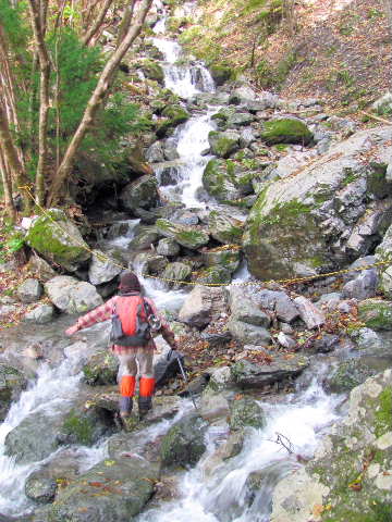 明神谷は紅葉には少し早かった。途中で明神滝を観て、水量の増えた数度ある渡渉に注意して下ると、林道に出る。