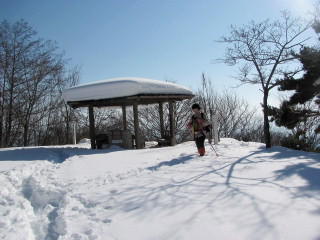 池田の森入口。 電話ボックスと避難小屋。 ここでカンジキを装着。 |