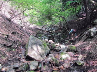 ガレ石の多い谷を一歩一歩慎重に下ると、武奈ヶ岳が二百名山であるためか、若者の登山者とすれ違う。さすがに登りはキツイようだが、最短で登るのには正面谷が便利である。