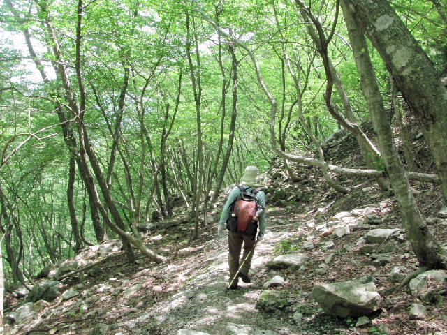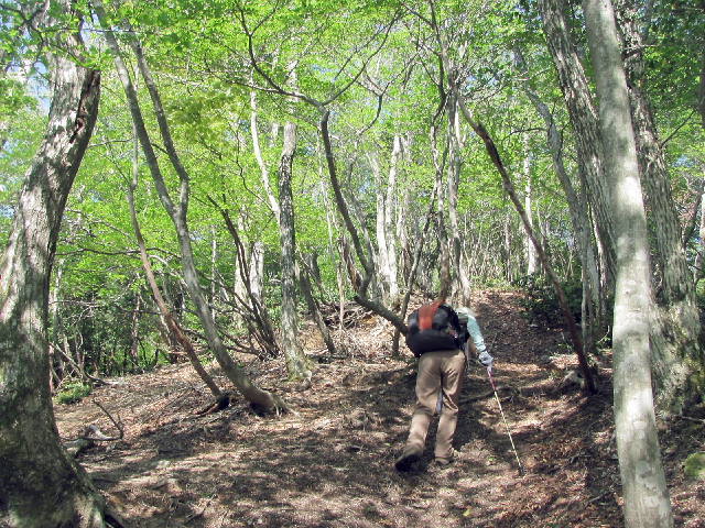 植林内の道を避けていたかのように、自然林との境目の尾根(堂満東稜道)になんとか辿り着く。新緑の落葉樹林の尾根道は青葉が輝き美しい。
