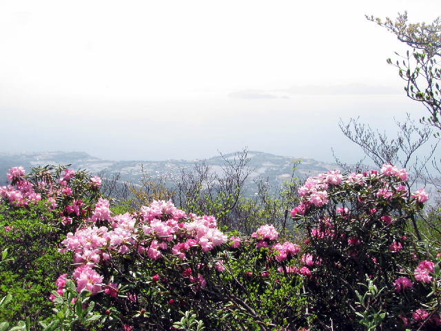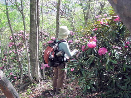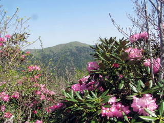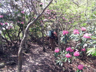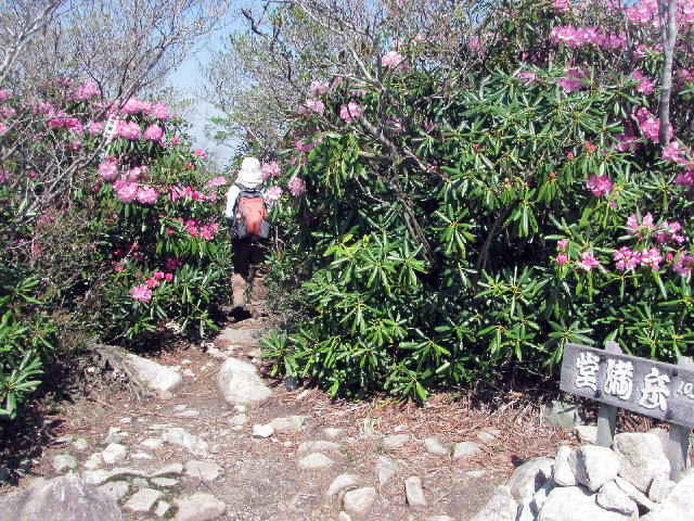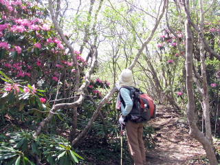 シャクナゲの群生する縦走道を歩く。出合う登山者は同年代夫婦が多い。ここで出合うのだから私たちとは逆コースのお手軽コースのようだ。