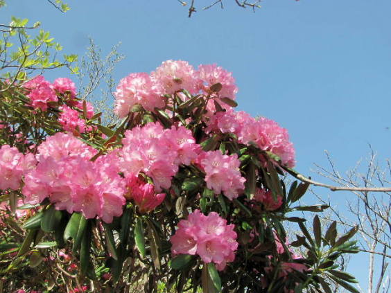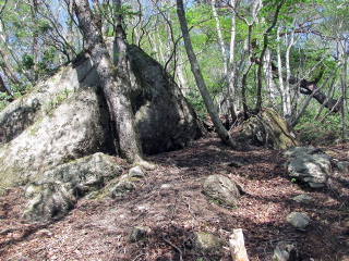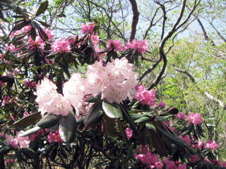 尾根道に大岩が現れる。ここを過ぎれば北斜面にシャクナゲが咲く群生地がある。大きな期待と、少しの不安を抱いて登ると、満開のシャクナゲが咲いていた。できることなら北斜面を下りたい程である。