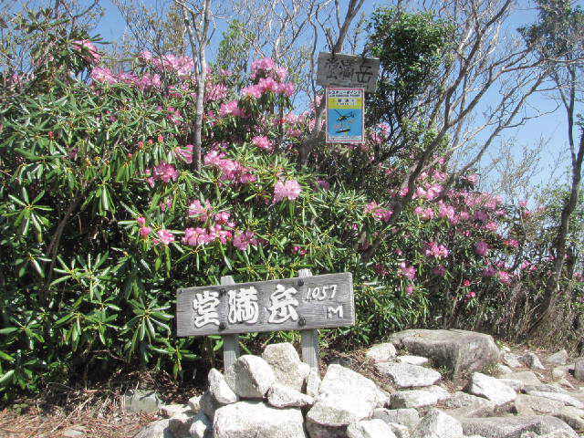 ロープのある岩場を急登すると誰もいない堂満岳頂上に着く。山頂のシャクナゲも見頃だった。