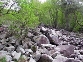 金糞滝を巻いて下ると、大石が積み重なった青ガレといわれるガレ場になるが浮石がないので、怖さを感じないのは私だけか?