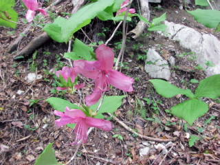 東レ新道を下山しているつもりだったが、抉れた崩落箇所もなく、比良山系縦走道に出合って前回の雰囲気と違い、分岐の道標もない。どうも山頂にロープが張られた所が東レ新道だったようだ。しかし下山した道もシャクナゲ街道なので楽しませてもらう。
