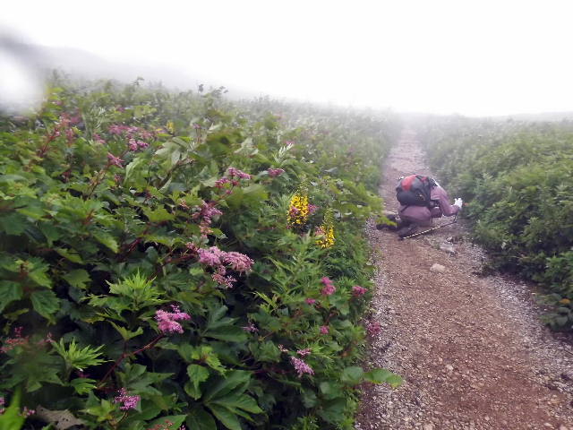 シートを敷き、壁にもたれて仮眠する。御来光の時間だが外はガスで真っ白なので更にウトウトしていたが、雨の心配もあるので急いで朝食を済ませ、お花畑を散策に出かける。