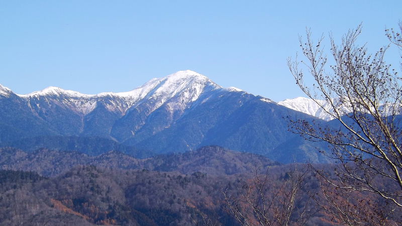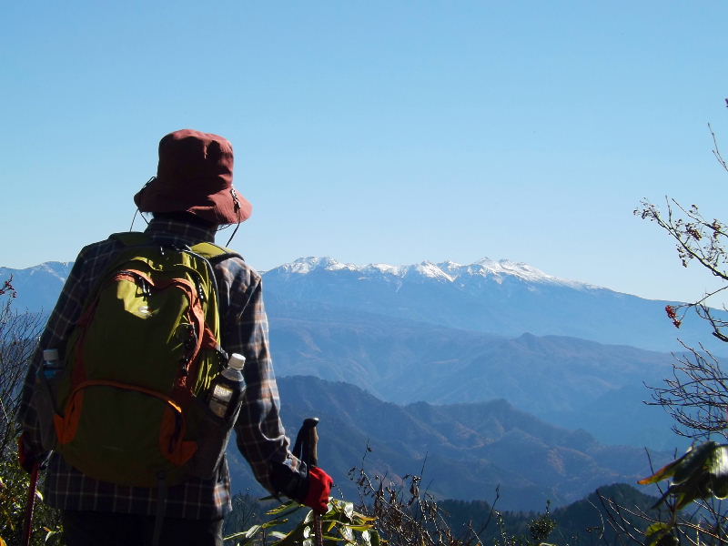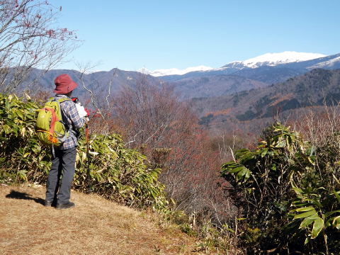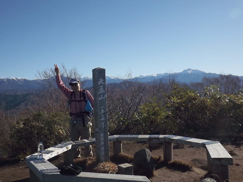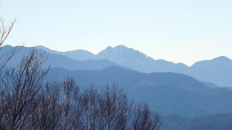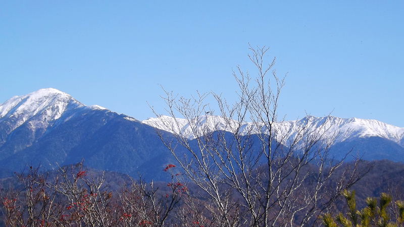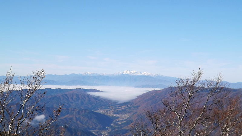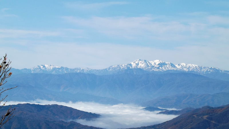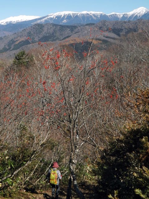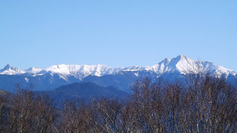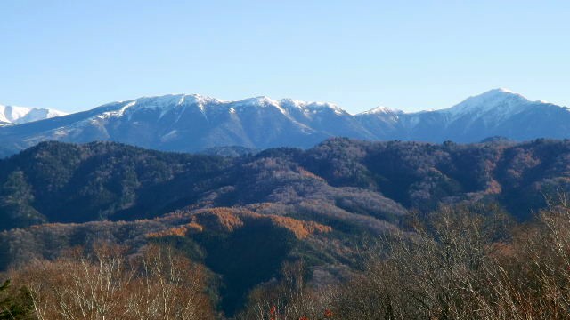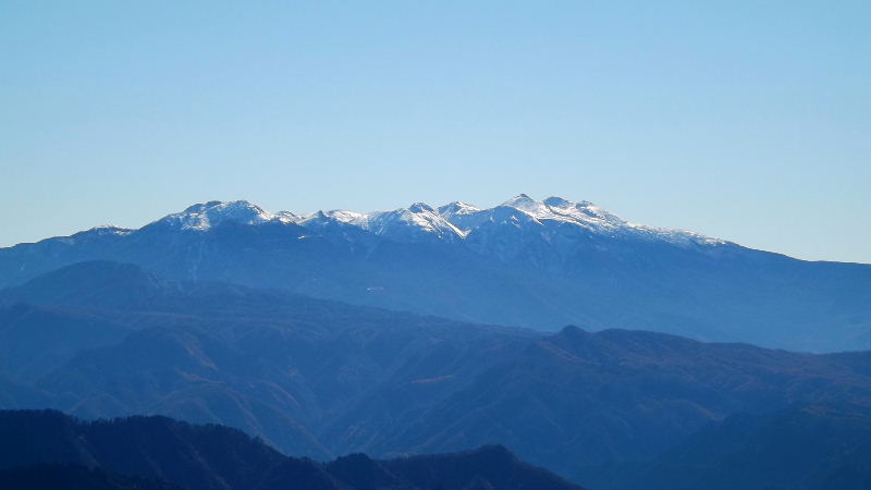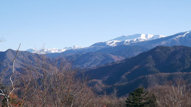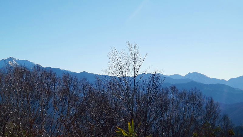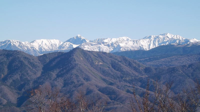 ![]() 尾根道になりました。背後には冠雪した北アルプスが・・。 やったぜ! |