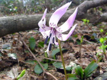 藤倉山から下山。ブナ林内の下山道が続き、南北の展望が良い鉄塔下に出て来てブナの原生林が終わる。 二つ目の鉄塔付近で初めて女性四人グループの出会う。更に少し下った所で夫婦の登山者と出会う。手にはコシアブラを二枝(写真)持っている。 木曾義仲が籠城した燧ガ城址を過ぎる。途中で自生していたコシアブラを私たちも10枝ほど採取して、いよいよカタクリの群生地に入る。 ピークは過ぎていたが、充分に鑑賞できるのが多く咲いていた。 白い花の有り場所を尋ねると「城址付近で毎年咲いている」と聞いて、再び12分ほど登り返して探すが見つからず(最近、不心得者によって盗まれたらしい)。下山して新羅神社近くに咲く白いカタクリを観察する。 神社前の道路を北へ、古い家並みが残る今庄の町を歩いて朝の登山口に戻る。 |