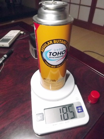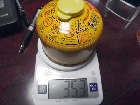 ![]() カセットガスの総重量354gです。 約170g注入したことになります。計算上では微妙に違いますね。 キャップ付けるのを忘れたからかな? |