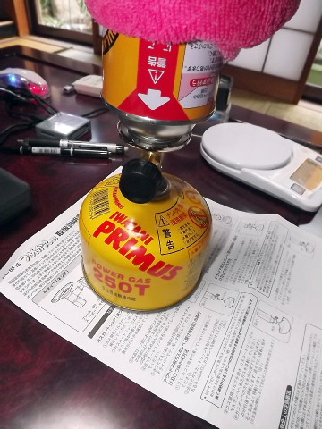 プリムスT型ボンベの満タンの総重量は375gです。 NET225g(ガス量)です。 中途半端に残っている残量ガス35gのボンベに注入してみます。 カセットガスをつめかえ君にセットし 冷蔵庫で冷やしておいたT型ボンベもセットして注入を開始。 カセットガスには電子レンジで温めた濡れタオルを巻きつけます。 ガスが移動している音が小さく聞こえます。 初めてなので約2分ほど注入して、止めました。 ※説明書ではT型ボンベを凍り水に漬けると10分ほどで 完了とあった。 入り過ぎると危険です。その時はカセットガスを下にして 戻します。 |