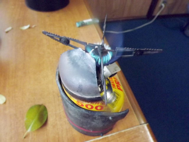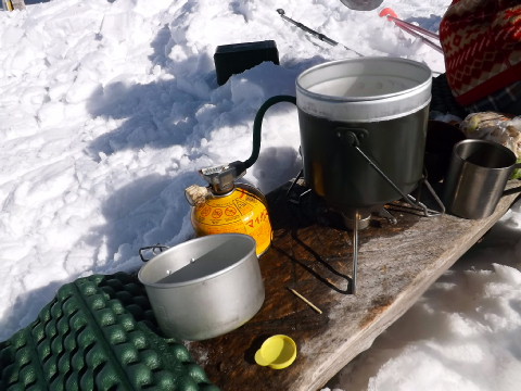 | 2回目(2月1日)ではボンベを雪上に設置して使用したが、 時間が経つにつれて火力は弱くなった。 コンロとボンベが別々なので お奨めできないが、時々暖めながら料理した。 追伸:自作のパワーインクリーザと併用で ストレス無く沸騰させることができるようになりました。下段画像 |